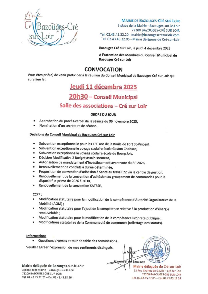 Jeudi 11 décembre 2025 – 20h30- Conseil Municipal – Salle des associations- Cré sur Loir 5 décembre 2025 | Aucun commentaire Non classé