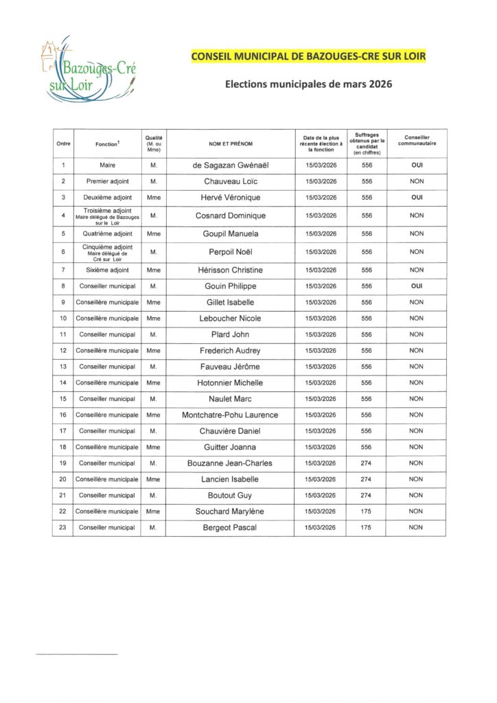 Liste des nouveaux élus pour la commune de Bazouges Cré sur Loir 26 mars 2026 | Aucun commentaire Non classé