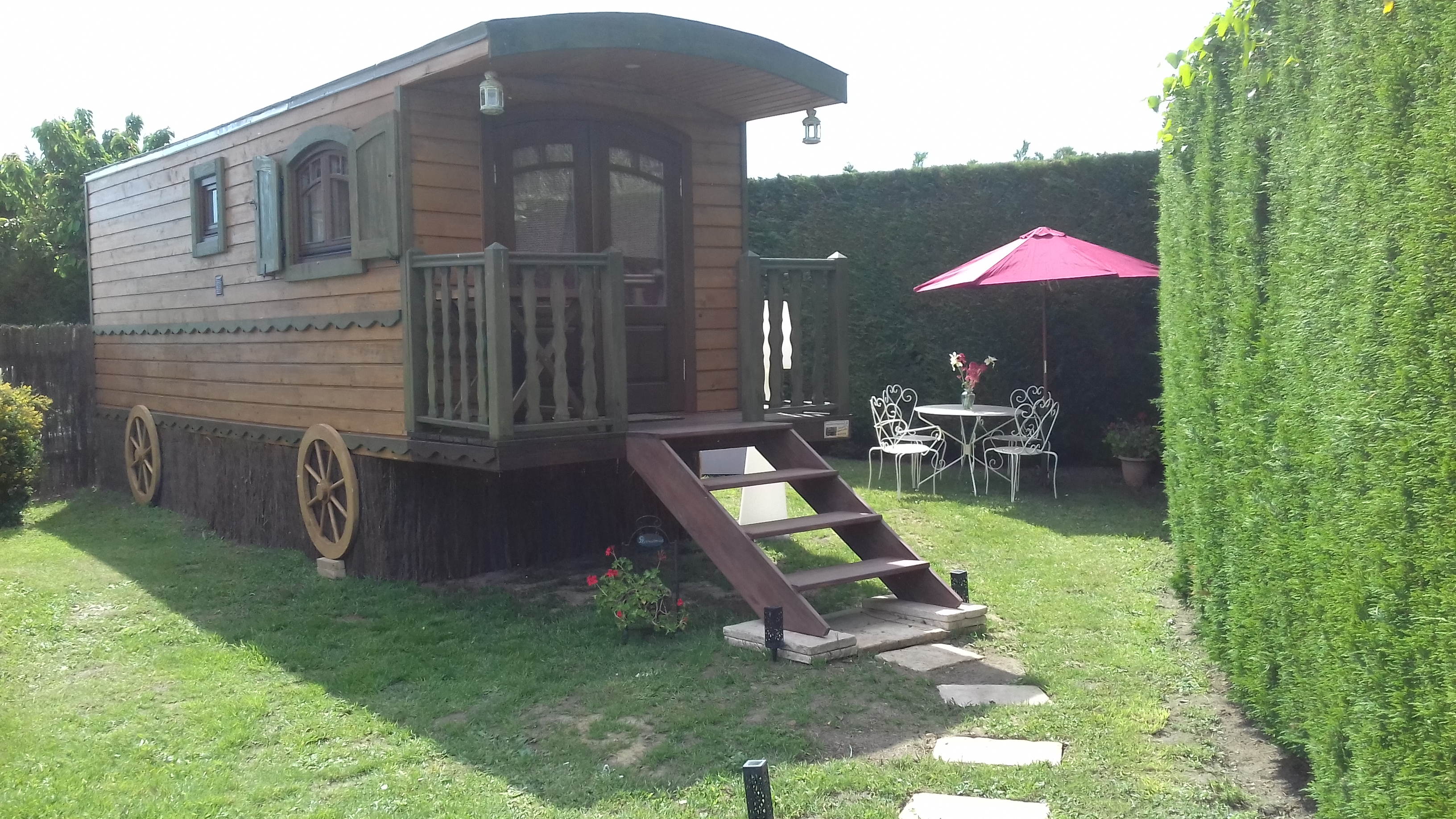 La roulotte se situe sur un terrain paysagé, clôturé à proximité de l’habitation des propriétaires.